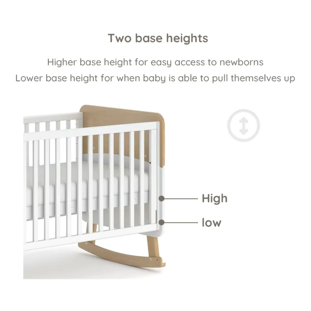 Recommended for newborn to 5 years old. Use higher base level for newborns, and move to lower base level once baby can pull themselves up. Can later convert cot to toddler bed with guards, no extra parts required.
