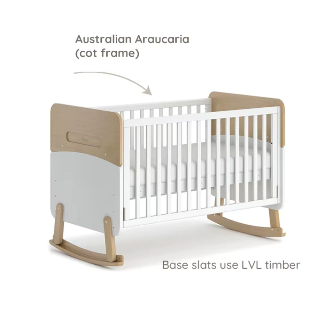 Cot frame crafted from sustainably sourced Australian Araucaria and New Zealand Radiata timber. Base slats use laminated veneer lumber (LVL).